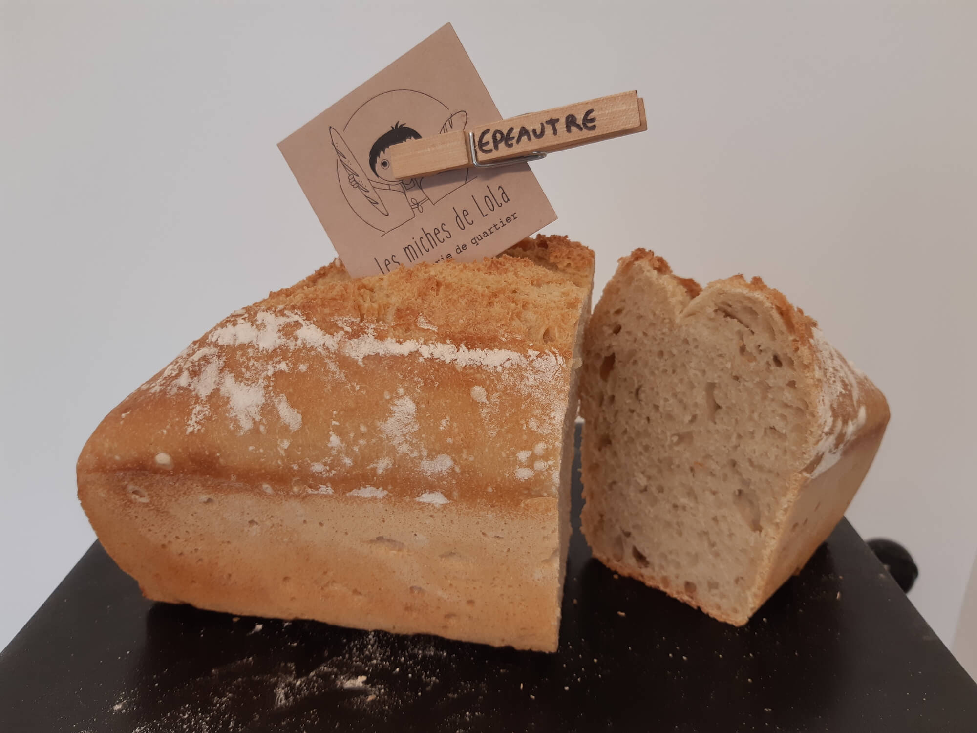 Farine d’épeautre 80%, eau, sel de Guérande. Au levain.